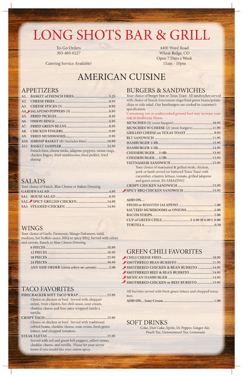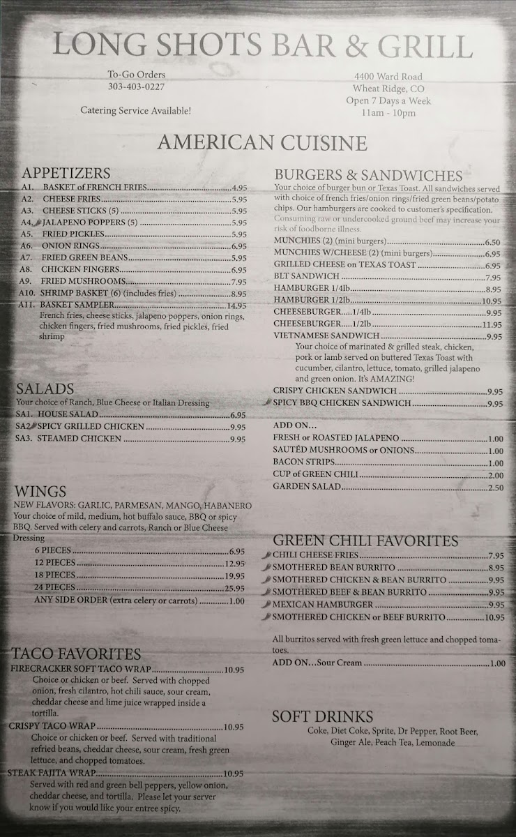 What truly elevates Long Shots is their commitment to hearty portions and distinctive flavor profiles, from the fried chalupa-style tacos to medium spicy wings accompanied by cool celery and blue cheese. The menu caters well to casual diners and sports fans alike, making every bite satisfying while complementing the laid-back, welcoming atmosphere. Whether you’re here for game day or a casual night out, Long Shots’ menu delivers consistently flavorful, well-prepared dishes.